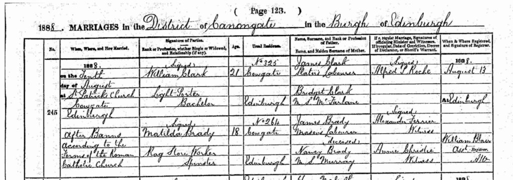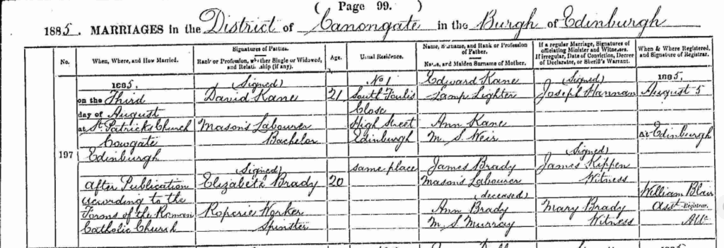 Here we see the marriage between Elizabeth Brady and David Kane. Both residing at No. 1 South Foulis Close, High Street at the time. Edwards’s father was Edward Kane, a Lamp Lighter in Edinburgh and her mother Ann Weir. Elizabeth’s family with James and Ann producing one of her four surnames for the occasion. St. Patrick’s Church was in nearby Cowgate where little Ireland was nestled.