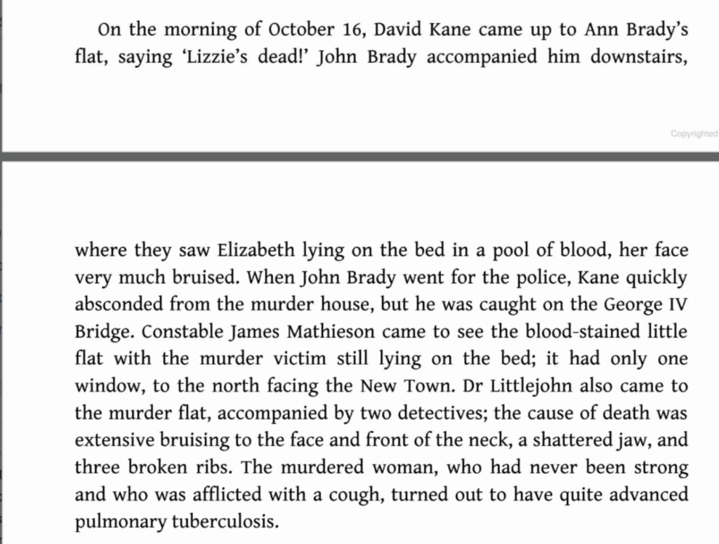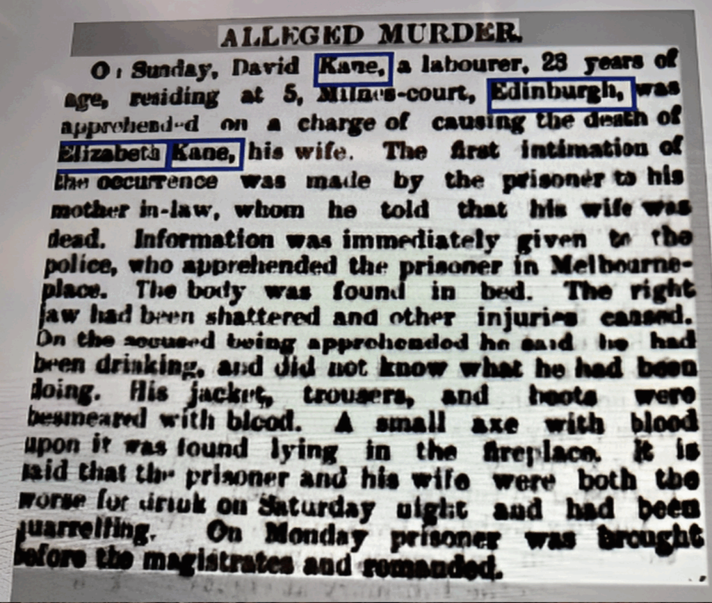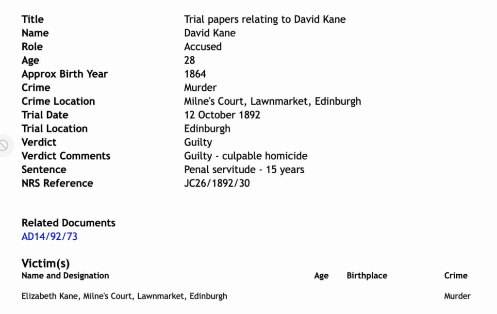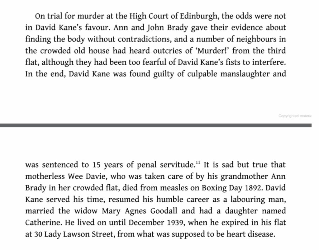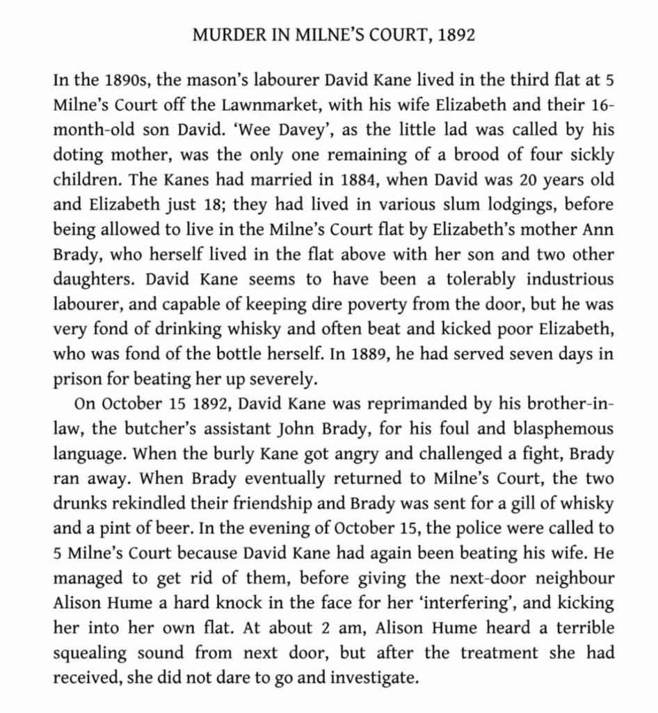 It was well known to their neighbours that the two of them would like to have a dram or two. David could not handle the drink however and this led to their frequent arguments. They had four children, three of whom died as babies. One son left who was often left with his grandmother Ann Brady in the flat above at Milne’s Court. He died of measles on Boxing Day 1892.