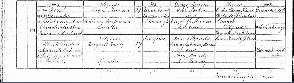 Angus Morrison married Margaret Brady on 1st December 1893 at No. 5 Milne’s Court, Lawnmarket, Edinburgh. This was one year after her sister had been murdered in that same Block of Flats. She lived in the flat above her sister with her mother Ann Brady and her brother John Brady. See below for details of this tragic event.
