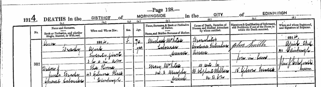 This was her death in Gilmore Place Catholic Nursing Home in Gilmore Place in Edinburgh. She gives her father as Michael McIntee. Her mother as Mary Murphy. Her son in law was John Smith who married her other daughter Mary Brady.