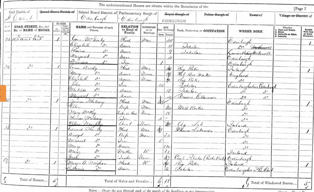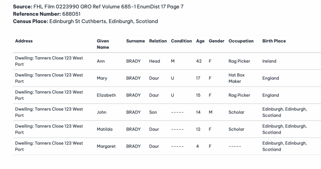 This census gives you a timeline for Ann Brady. 1881 tells us that she was born in Ireland and still married at this time, although no further information has been found on her husband since then. Her occupation was one of a Rag Picker. Daughters Mary and Elizabeth both born in England. Then John, Matilda and Margaret in Edinburgh. This gives us the timeline of arrival in Edinburgh as between 1866 and 1867.