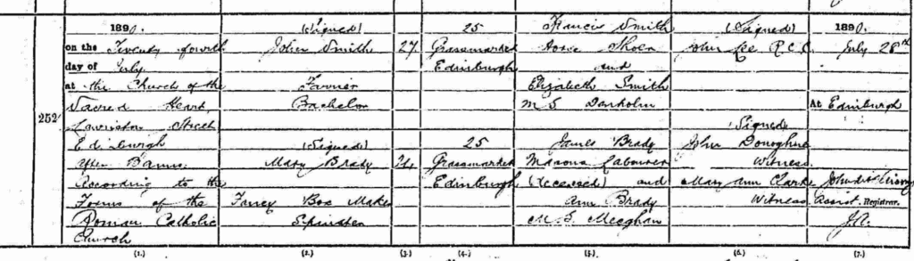 Mary married John Smith, who was born in Londonderry in Ireland. The marriage took place in Lauriston Church of the Sacred Heart which is just off the West Port side of the Grassmarket. She still is a Fancy Box Maker. Her father James now officially deceased and her mum Ann sporting yet another surname Meeghan. They had a large family some settling in Canada and Australia. John was a Blacksmith.
