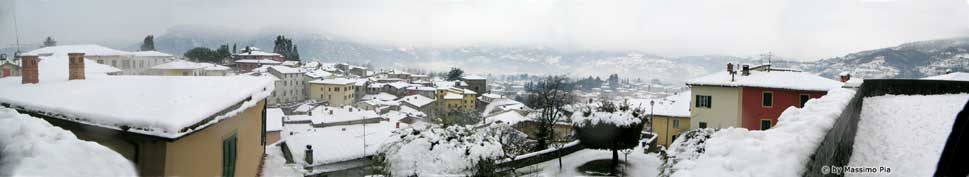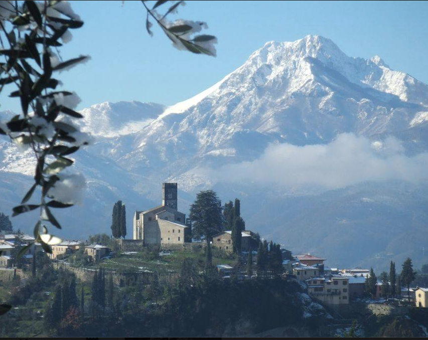 Barga’s shadowy passages are good to explore and if you climb high enough there is a broad flight of stairs which lead you up to the Duomo. From this vantage point you can look down on the rooftops below and beyond them and across the valley of the Apuan Mountainsa and in particular the White planed summit called Monte Pania della Croce. The white snowy top never seems to leave her high peaks. But of course it does snow in Barga as the photograph above shows and also the photos here as shown in utube